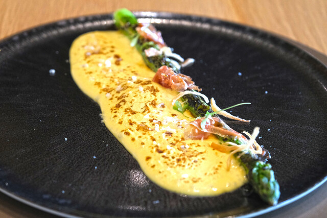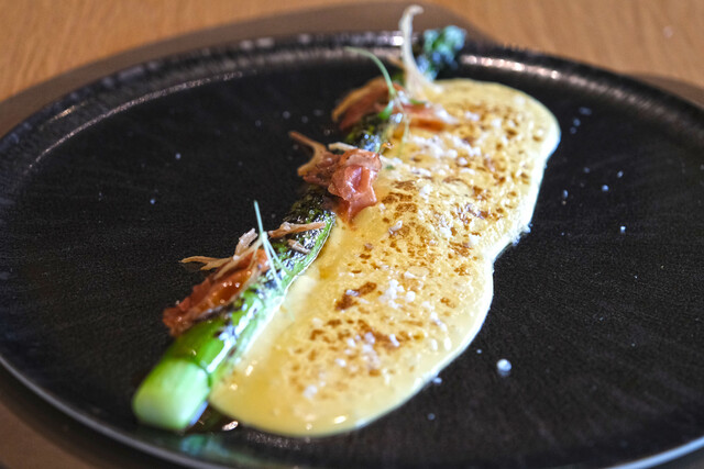 ランチコース 16488円 の北海道産グリーンアスパラの炭火焼