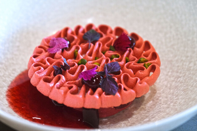 ランチコース 16488円 のグリオットチェリーとピスタチオのバシュラン