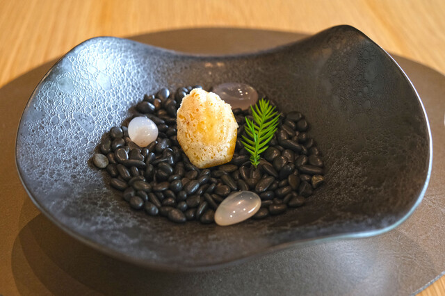 黒く楕円形の皿に黒飾りをのせて提供されます。