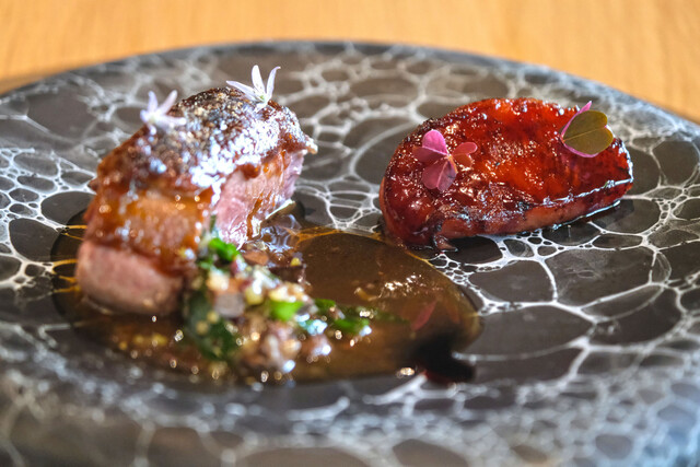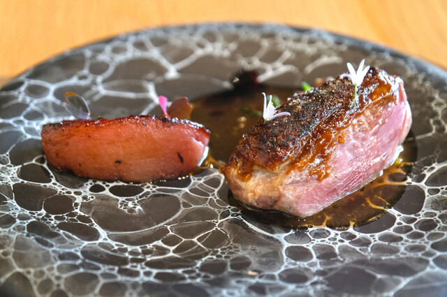 あいち鴨のレバーとニラを使ったソースで