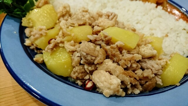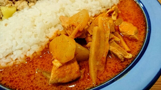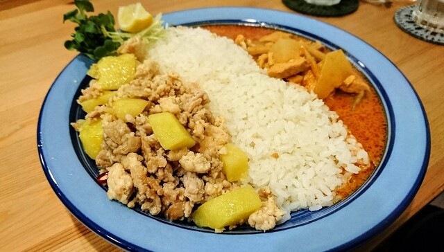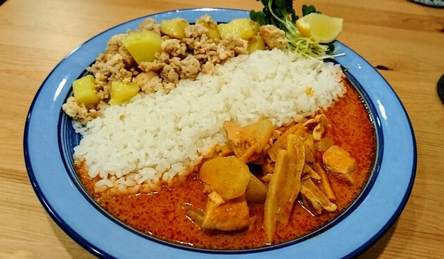 「Bセット(1100円)」は、レッドカリーとドライカレーの二種類がワンプレートに盛られた超お得な一品。レッドカリーは辛さはそれほどでもなくまろやかでかなりイケてます。ドライカレーは鶏そぼろとじゃがいものキーマ風。ライスがチョッと多かったので次回は「ライス少なめ」で頼もう。