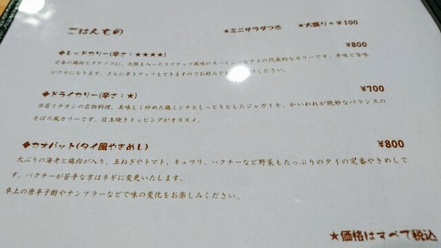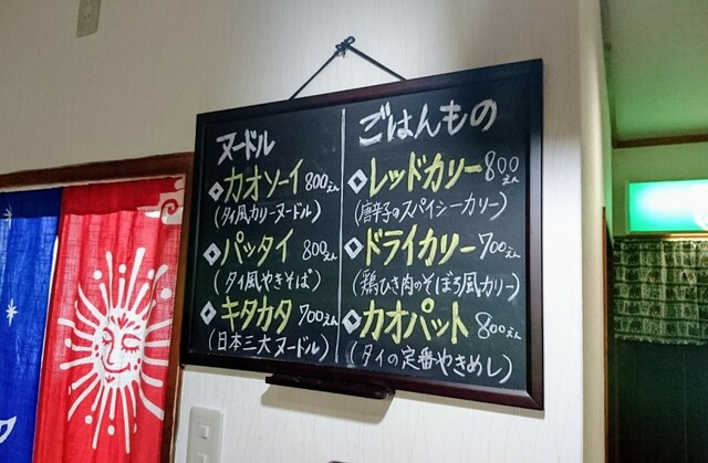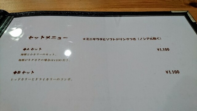 メニューは色々あるがセットが最初は無難かも。「Aセット」は、麺類と小カリーのセットで通常は1100円。画像の「キタカタ(喜多方ラーメン)」だと100円引き。小カリーは「レッドカリー」「ドライカリー」「カオパット(タイ風やきめし)」から選べます。「レッドカリー」を食べたが撮り忘れ(笑)
