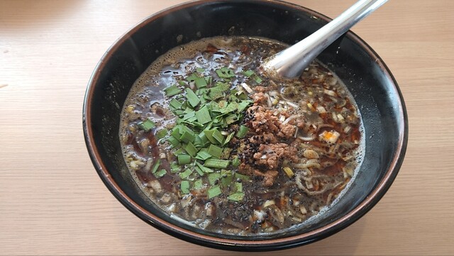 今回は月限定の「黒ごま担々麺」と「B定食(レバニラ)」。かみさんは「麻婆豆腐定食」。黒ごま担々麺にはニラがトッピングされてる。黒胡麻が贅沢に使われていて香ばしい仕上がりで、細麺にスープが絡んでかなり美味い。愚生的に辣油をもっと多くても好いと思うが、バランスの好い味わいです。