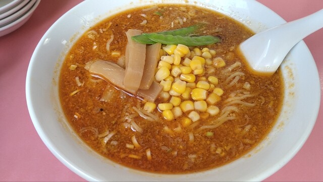 担々麺はコーンが載ってるので味噌ラーメンっぽい見た目。芝麻醤が効いたものではなく、摺った胡麻と自家製辣油のコラボ。辛さは控えめで胡麻の風味が漂います。ストレートの細麺はのど越し好く、スープと絡んで美味しい。他では味わえないオリジナルの担々麺で、香ばしい仕上がりでうまし。