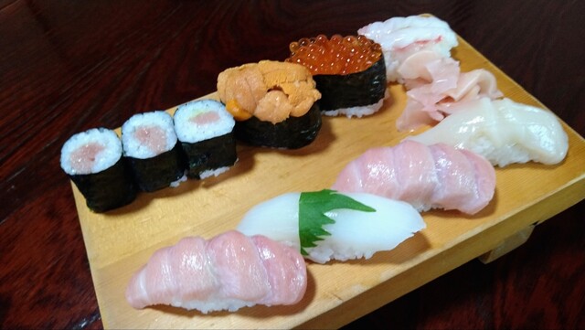 大トロ2貫、イカ、ホタテ、生海老、イクラ、雲丹、鉄火巻