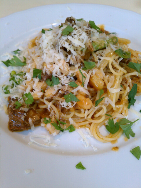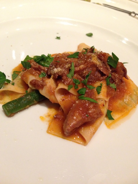 お肉(羊など)のラグーソースに幅広のパスタを合わせてます。