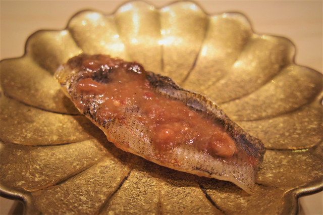 脂ののった白身に酒盗で、ガツンとくる味わい。