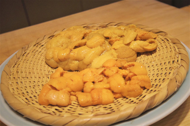 一番摘みの有明海苔でさっと包んだ2種の雲丹。
