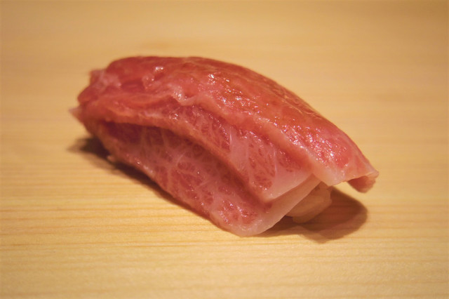 脂がのって最高に美味しい部分、筋から身をとった「はがし」を2枚重ねで握っています。