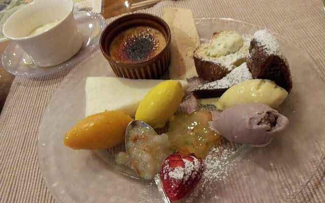 この日のデザートは、白ゴマのブラマンジェ、シナモン風味のクリームブリュレ、フーチーバーのシフォンケーキ、ガトーショコラ、ピーチパインのパルフェ、グアバのムース、紫いものアイス、ウコンのアイス、マンゴーのソルベ、ミントのソルベ。