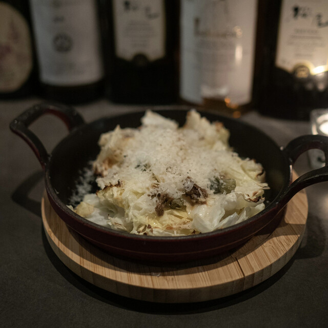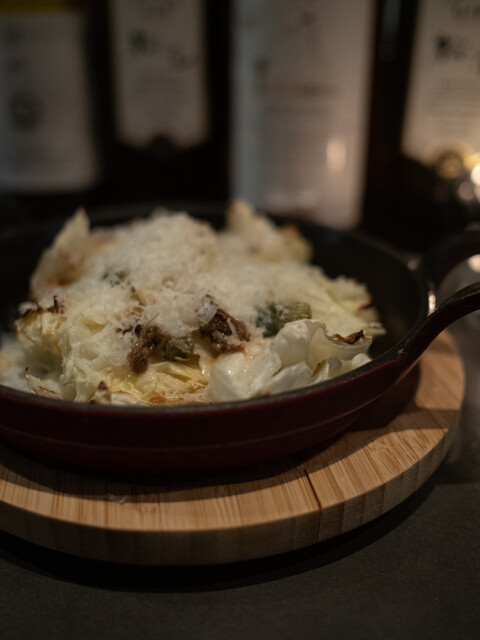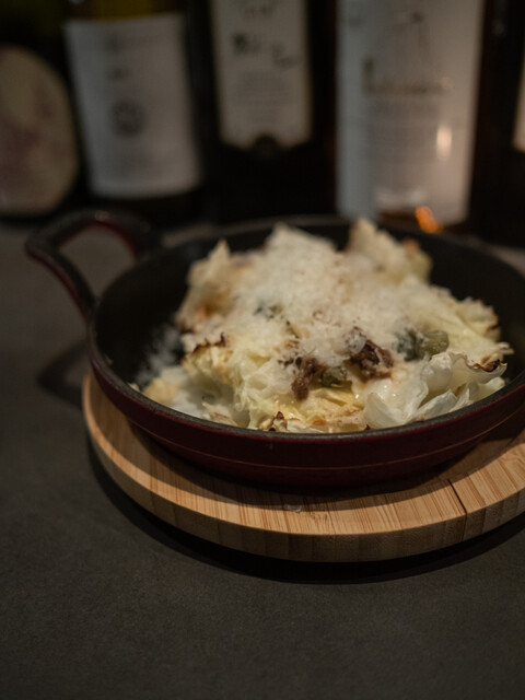 主にオーブンで火入したキャベツに、アンチョビと、ケッパーを入れてペコリーノチーズをたっぷりかけた一品