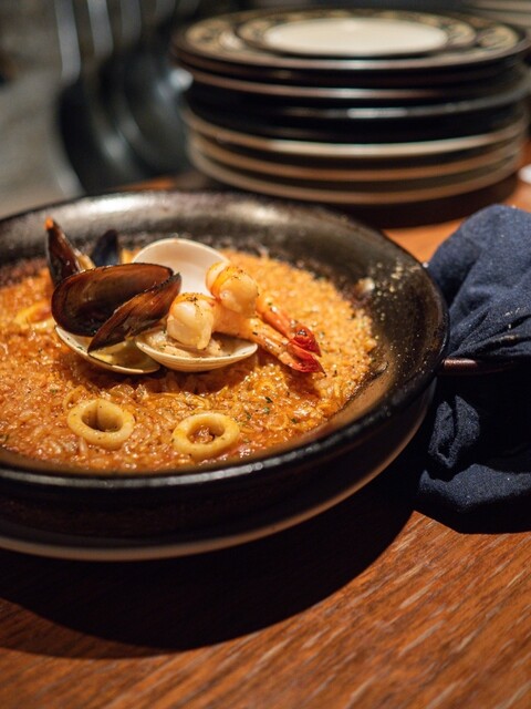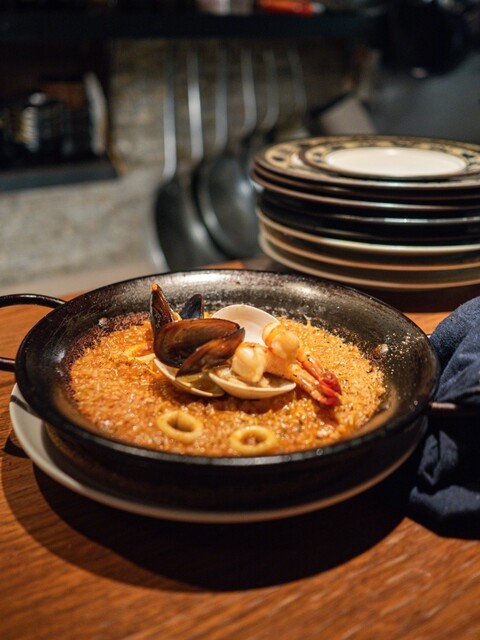 料理はスペイン郷土料理がベースで、豊富なタパスに定番のパエリアやフィデウア、炭火焼といった感じ