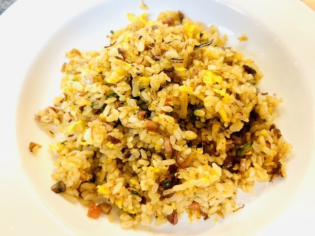 生の食材を使った海鮮炒飯とは一線を画していて、濃縮されたエッセンス的な香りと、噛めば噛むほど干物特有の味わいが口一杯に広がり、その後で金華ハムの味わいが追いかけて来ます。