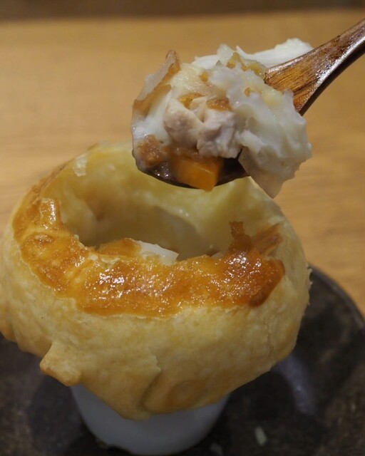 ブレス鶏とこだわりベーコンのパイ包みスープ