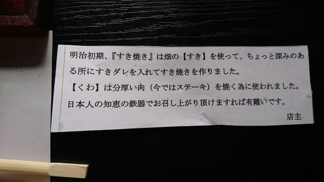 リブステーキは「くわ」で焼かれていています。こんなのは初めて見ました。