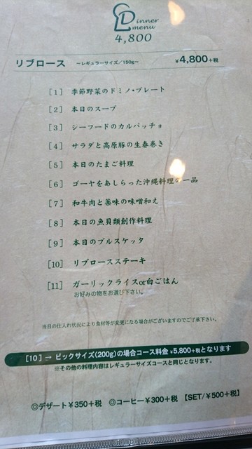 3000円のコースにしようと思っていたのですが、ついつい4800円のリブロースコースにしてしまいました。食べログ書くしと思って・・・見栄っ張りです(泣)