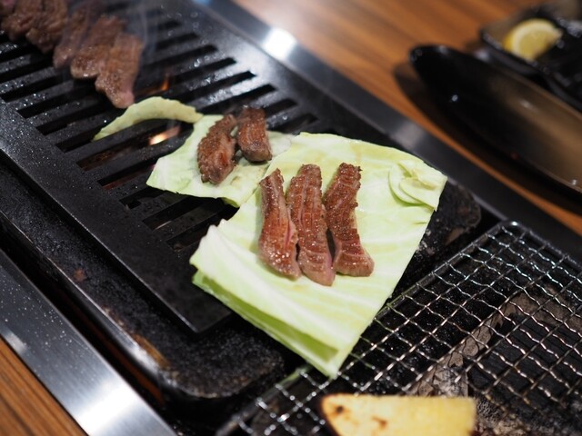 レア目に焼いたタンは、きれいに切り分けてキャベツの上で「保温」してくださるので、うっかり焼きすぎて硬くなることはありません。また、もう少し焼きたい人は鉄板に戻して、お好きにそうぞという至れり尽くせりの心配り。