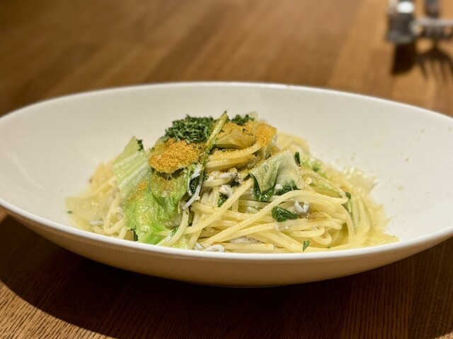 今日のランチは、ちりめんじゃことキャベツ、カラスミのスパゲッティ。