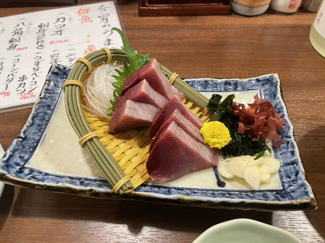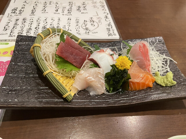 刺身は縞あじ?、かつお叩き、マグロ赤み、サーモン、鯛、タコといったところか。