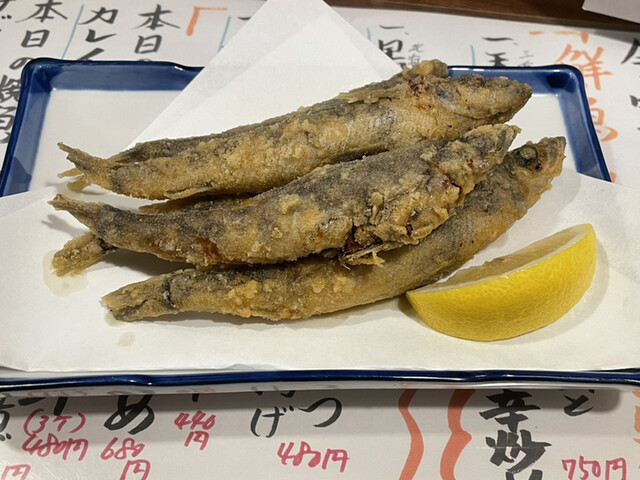お通しもサーモンと小魚を揚げたもので日本酒によく合う。