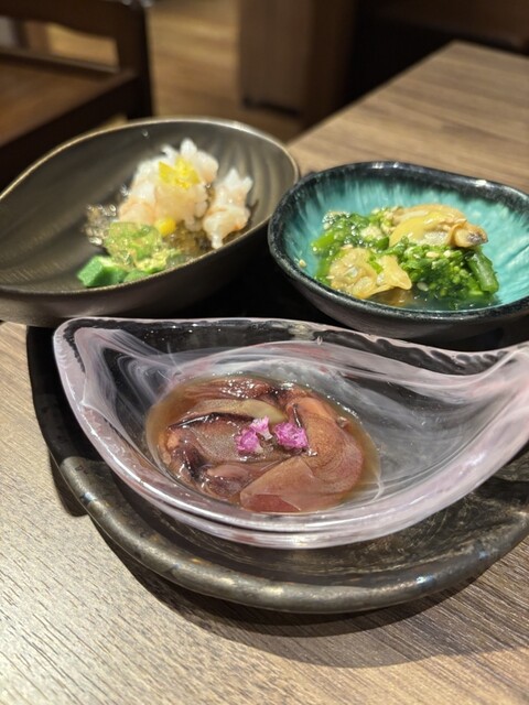 まずはお通しの『あぐー豚の梅しそ餃子』とおすすめ小鉢3種からスタート。