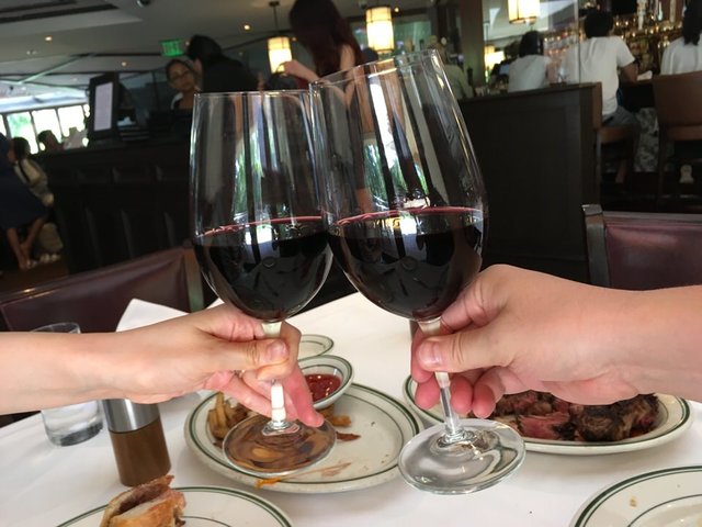 ステーキには赤ワイン!2杯目はハッピーアワー価格7ドルのグラスワインで。