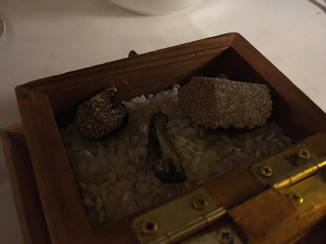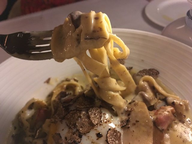 このカルボナーラはちょっと贅沢な感じで、生トリュフが別の箱に入ってやってきて、テーブルで直接トリュフをスライスしてパスタにかけてくれます。