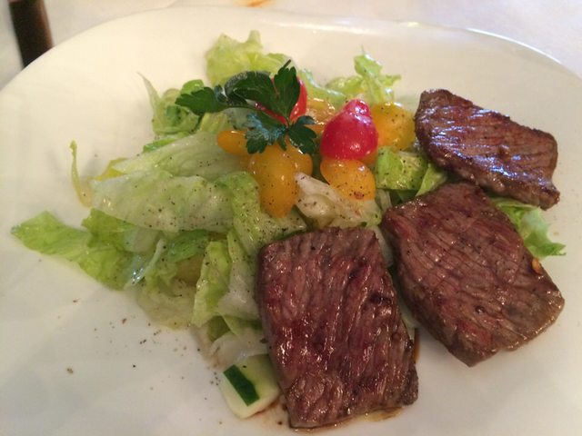 サラダの味はバルサミコ酢で甘酸っぱい感じで、ステーキは内臓に近い部分なのでしょうか、レバーの味がするお肉でした。