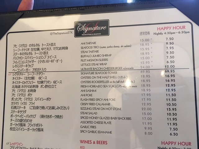 シグネチャー・プライム・ステーキ&シーフードのハッピーアワーの時間帯は4:30pm〜7:00pmまで。その中で料理を頼めるのが5:00pm〜6:30pmというシステムです。料理によっては半額のものもあるそうで期待が膨らみます!