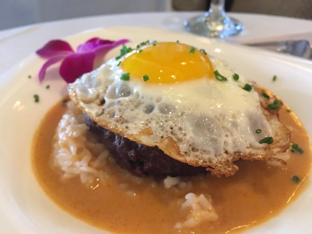 白いご飯の上にハンバーグと目玉焼きが乗っているのは普通のロコモコと違いありませんが、ソースがクリーミーロブスターグレービーなところが珍しいですね!