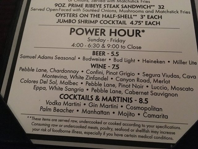 「PowerHour」がハッピーアワーのことで、土曜日以外の4:00-6:30、9:00-Closeに開催中とのこと。土曜日は開催していないところは注意が必要ですね。