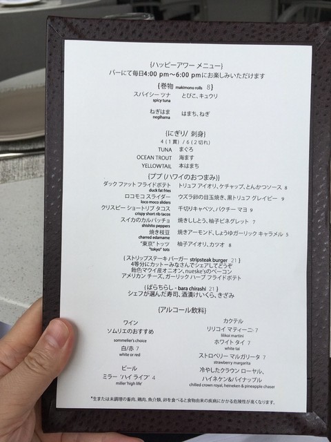 寿司推し?のハッピーアワーメニュー店内のカウンター席に座ると、ハッピーアワーのメニューを持ってきてくれました。