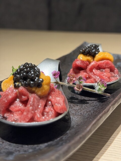 旨味が濃い神楽極ユッケに、バフン雲丹の甘みと