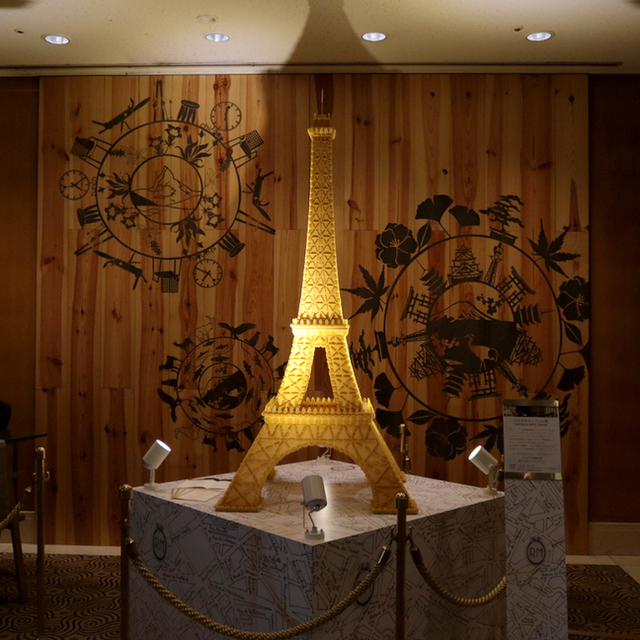 当日の12時、6Fメインロビーにて待ち合わせ。スイスホテルの副総支配人 兼 事業開発部長の深尾氏がロビーまでお迎えに来てくださり、当日の参加メンバーが揃うまでの間、ロビーに飾られているパスタ製エッフェル塔に関する裏話などを教えていただきました。