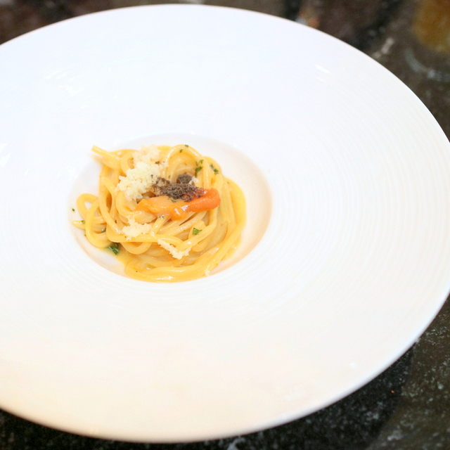 カルボナーラは家庭料理だけど、それを少しエレガントな感じにアレンジした料理。