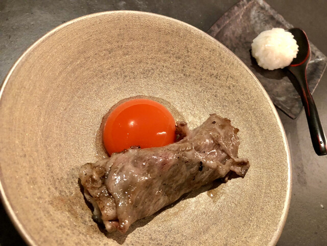 濃厚なサーロインを“ファフィ卵”とシャリ玉でいただく贅沢さ。