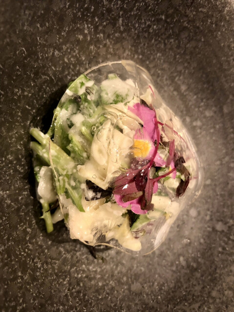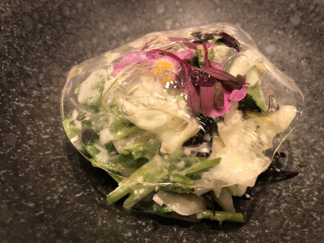 内容は、刻み赤貝、茄子マリネ、昆布出汁のジュレの春菊ソース