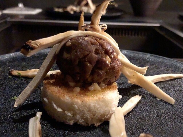鮑×ポルチーニの創作料理(竹炭仕立て)