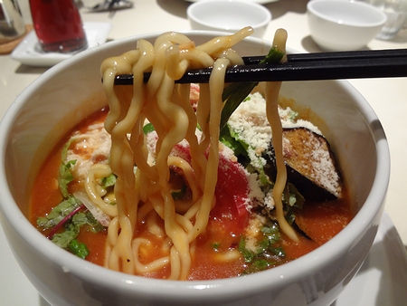 白湯トマト麺、蒸し野菜、半ライス、杏仁豆腐がセットになっています。最初に蒸し野菜が運ばれてきます。蒸し鶏は季節の野菜が使われています。この日の野菜は三浦半島で朝獲りしたもの。三浦の温暖な気候で育てられた野菜は味が濃く、旨みがありとってもジューシーです。この日の野菜は紅芯大根、黒長大根、紅白ミニ大根、ブロッコリー、紫いも、バターナッツ南瓜。野菜は甘味がありとっても美味しい野菜です。次に白湯トマト麺。チーズ、レタス、鶏肉、茄子。