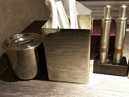 長野駅より東急とC−Oneの間の道を権堂方面に北上。上千歳町の信号を渡り、しばらく進むと左側にヌボー生花店権堂店がありその隣に中華そば鍾馗があります。以前は長野駅前で営業していましたが権堂へ移転してきました。暖簾も出てなく外観はラーメン屋には見えません。店内に入ってみるとたくさんのお客さんがいました。食券機で食券を購入して並びます。この日は30分ぐらい待って席につけました。店内はカウンター7席のみ。少し高めのカウンターからは調理している様子が良く見えます。店内はとってもお洒落。テーブルの上に置かれている調味料もいい感じ。ラーメン屋というよりもバーって感じの店内。