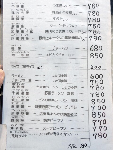 4人でおじゃまして,「加里鶏片飯 780円」×2(自分はコレ)と,「麻婆飯 750円」,「麻婆麺(スープなし)770円」,「焼きぎょうざ(5ヶ)650円」×3を注文しました(いずれも税込).