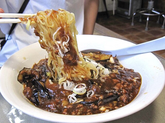 「麻婆茄子飯」は,揚げナスのタップリ入った麻婆餡を,ご飯にかけたものです.ネギのみじん切りがトッピングされていました.