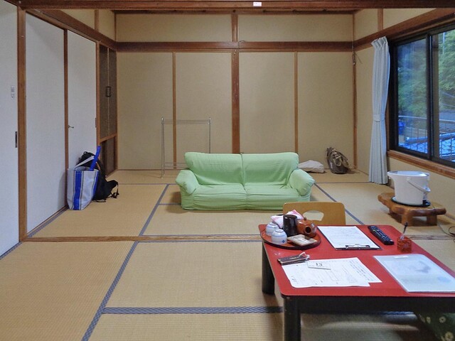 12畳間と6畳間で構成されており,広々としています.6畳間には,チェックイン時に既に布団が敷いてありました.座卓,ソファ,エアコン,TV,電気ポット等が装備されています.