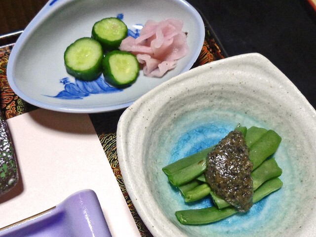 料理は14品くらいで構成されており,なかなかのボリュームです.はじめに 刺身コンニャク,ホヤ酢,フキの煮物,インゲンのゴマ和え,トウガンとエビの煮物冷製,刺身盛り合わせ(ヤシオマス・ヒラマサ・イサキの炙り),常陸牛の鉄板焼き(100g;卓上ひとり用コンロ;おろしワサビ・レモン・岩塩・粗挽きコショウ・タマネギダレ),漬物 がお膳に並び,あとから アユの塩焼き(シソ味噌添え),茶碗蒸し,天ぷら(イワシの梅肉巻き・シイタケ・甘トウガラシ・ナス;岩塩),ご飯,味噌汁,スイカ が運ばれてきました.