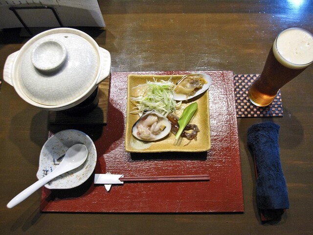 コース料理は,白貝・北寄貝・ホタルイカの貝ダシしゃぶしゃぶ & そうめん,貝ダシの寒天寄せ 土佐酢ジュレ,ホタルイカ燻製の牛タン巻き,貝ダシの茶碗蒸し & 春キャベツソテー,貝刺身盛り合わせ,ホタテ貝と春キャベツのソテー 貝ダシソース,サトイモの卵とじかけ & 生ウニ,貝ダシのリゾット,手作り桜餅 & アイスクリーム で構成されていました(料理名はテキトー).また,土産に ムール貝のしぐれ煮 をいただきました.