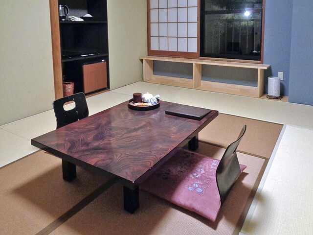 2階の和室に通されました.玄関(洗面台)・シャワー付きトイレ・10畳間 で構成されており,座卓・座椅子・エアコン・TV・空の冷蔵庫・電気湯沸かしポット等が装備されています.