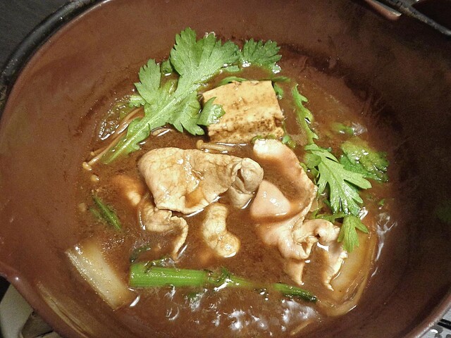 イノブタ鍋:今回のイチオシです.具材は 薄切りのイノシシ肉・薄切りのイノブタ肉・木綿豆腐・ハクサイ・シュンギク・ささがきゴボウ・エノキタケ等で,スープは八丁味噌ベースでした.
