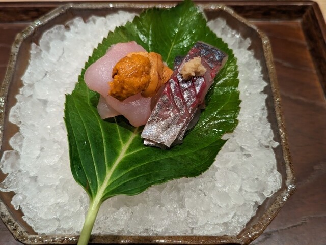 舞阪産首折れ鯵 五島列島産九絵 塩ぽん酢 土佐醤油(コース料理 料理長おまかせ)