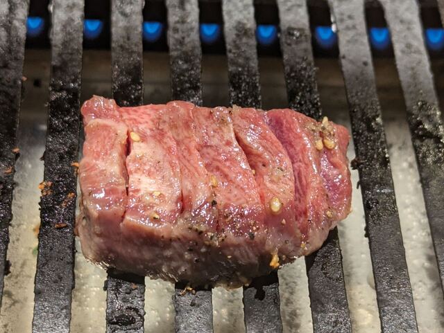 究極厚切り3点盛りの厚切りの上ハラミを焼いているところ