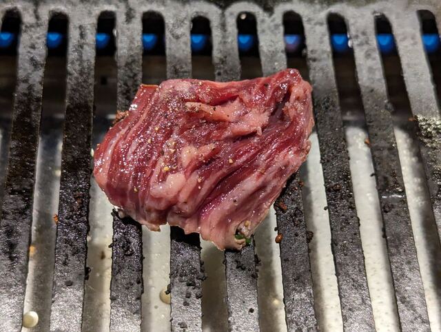すき焼きカルビ(月見ダレ付)のカルビを焼いているところ